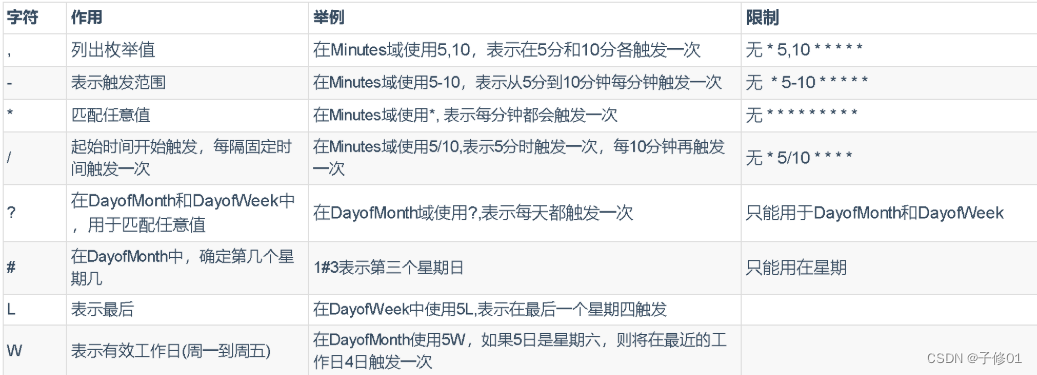 (7)“W”: 表示有效工作日(周一到周五),只能出现在DayofMonth域,在DayofMonth中使用5w,如果5日是星期六,则将在最近的工作日4日(星期五)触发,如果5日是星期六,则在6日(周一)触发,如果是工作日就在当日触发,有效工作日只会发生在本月。