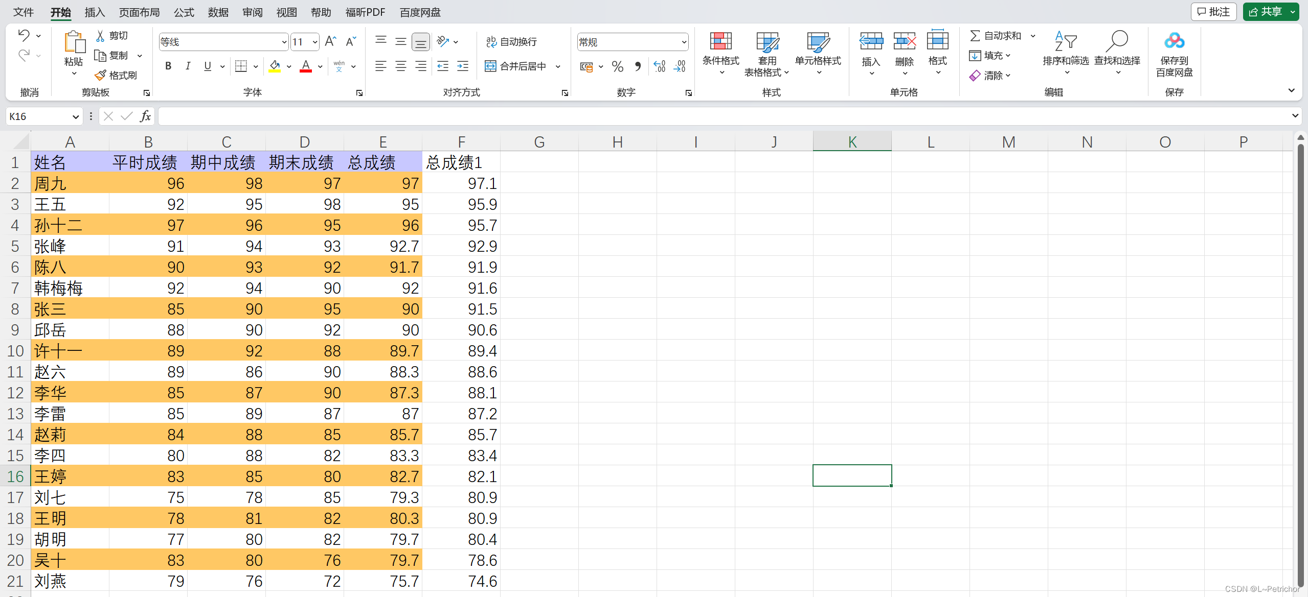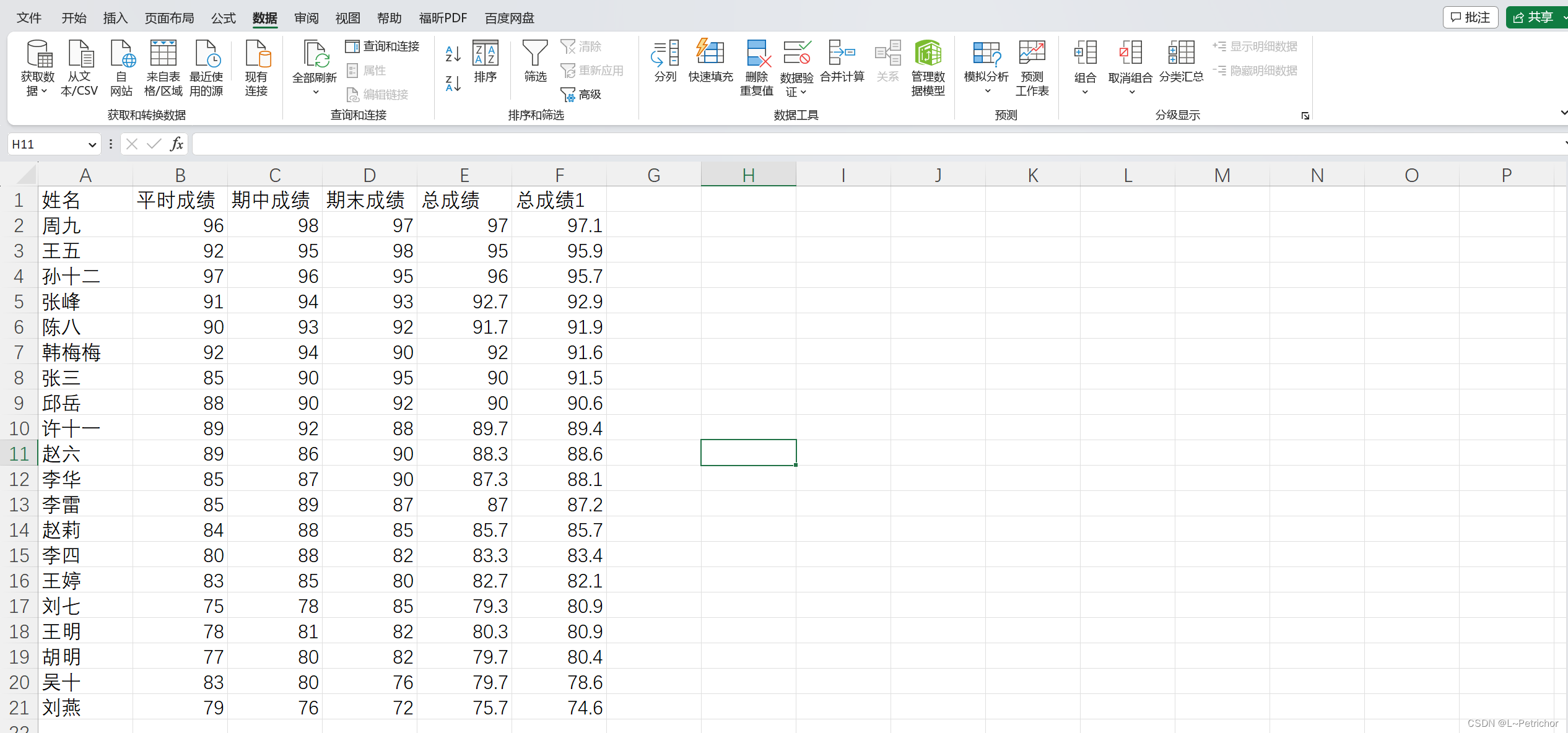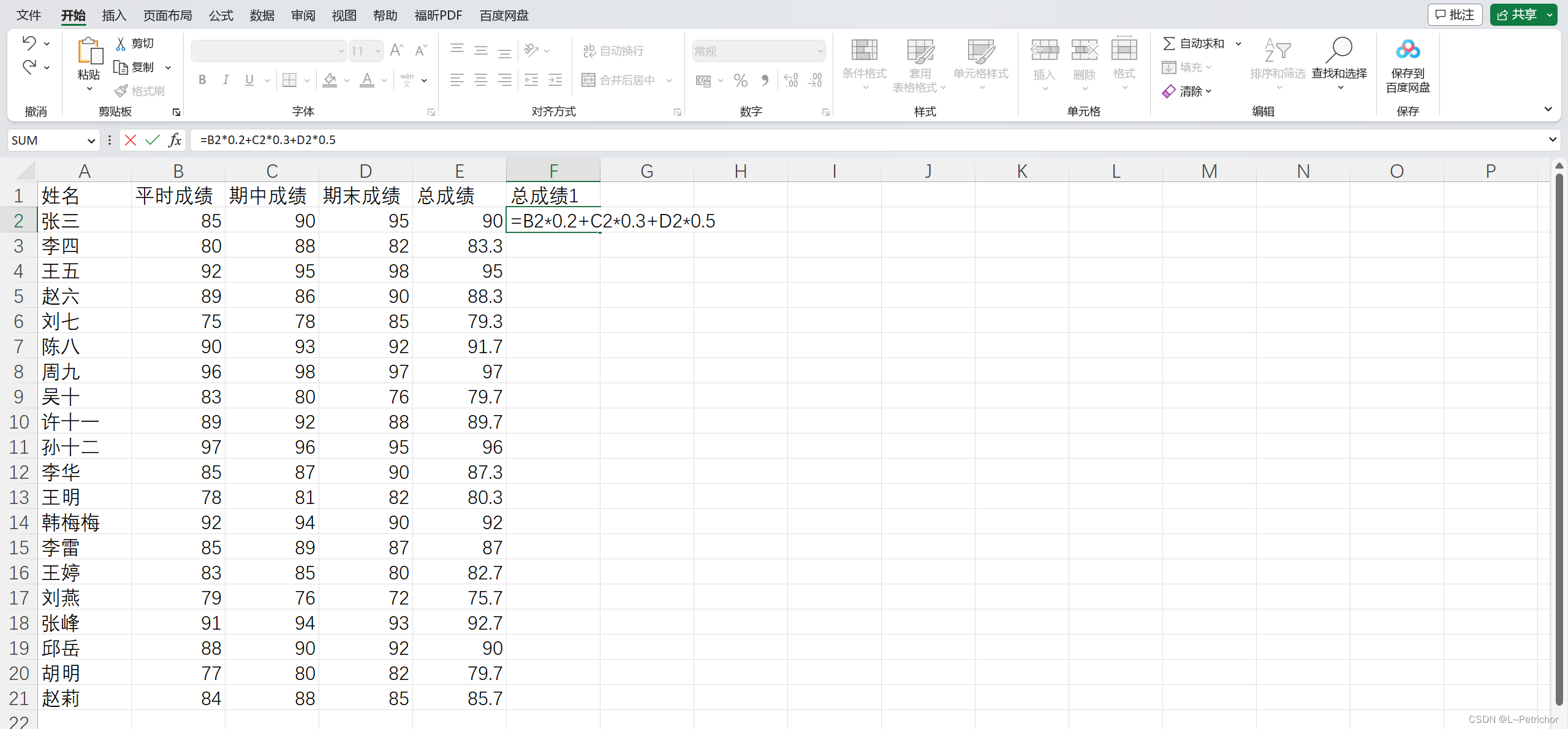 这显然不是一般做法,现在重新分配计算权重为“平时成绩*0.2 + 期中成绩*0.3 + 期末成绩*0.5”,重新计算总成绩。