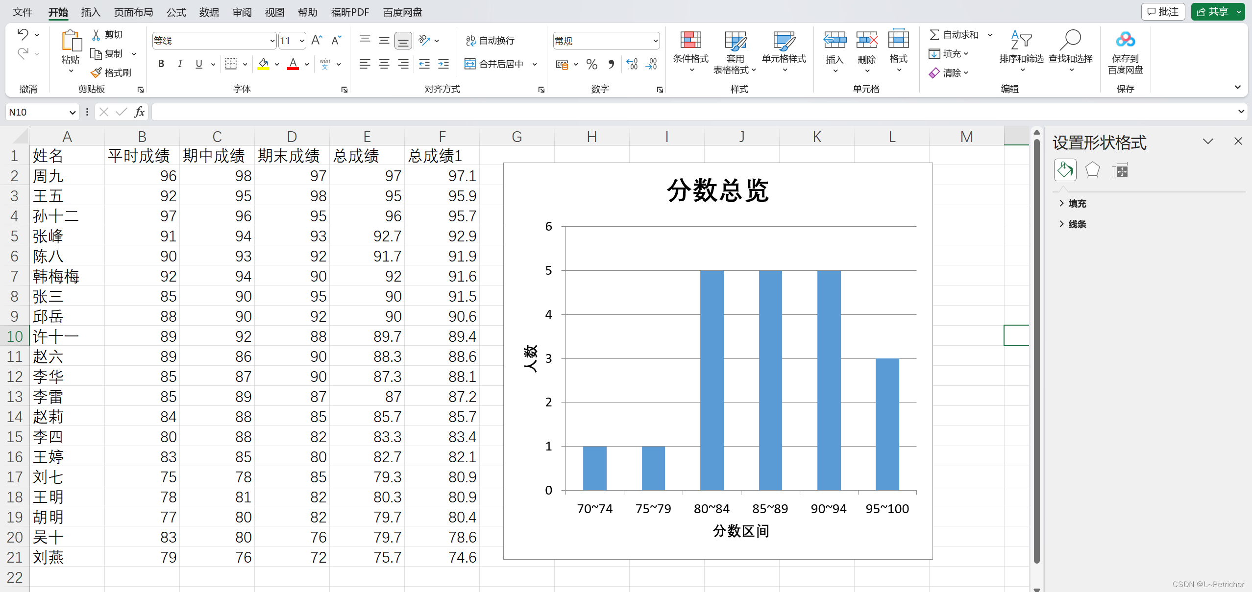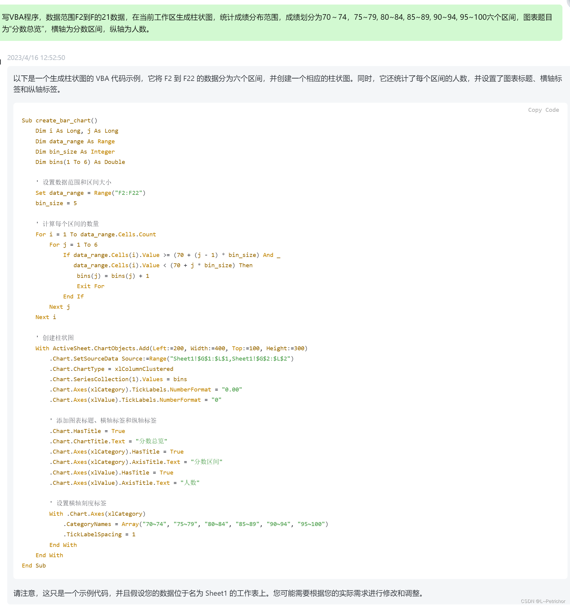 写VBA程序,数据范围F2到F的21数据,在当前工作区生成柱状图,统计成绩分布范围,成绩划分为70~74,75~79, 80~84, 85~89, 90~94, 95~100六个区间,图表题目为“分数总览”,横轴为分数区间,纵轴为人数。
