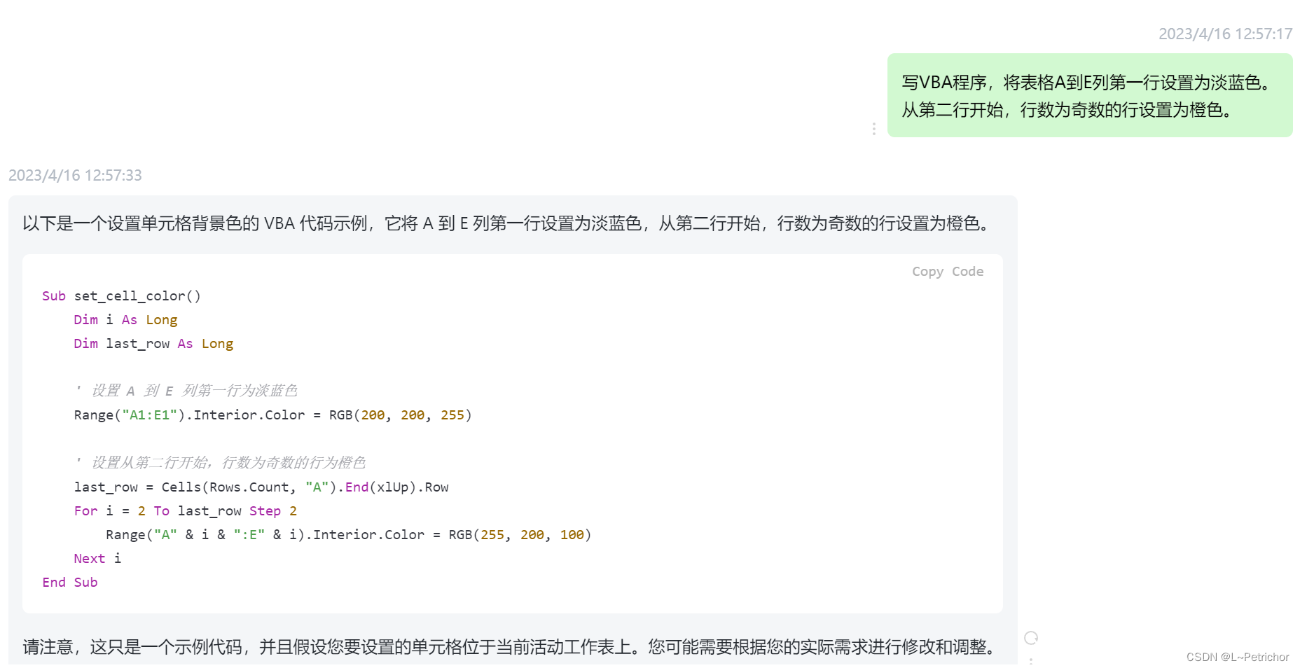 写VBA程序,将表格A到E列第一行设置为淡蓝色。