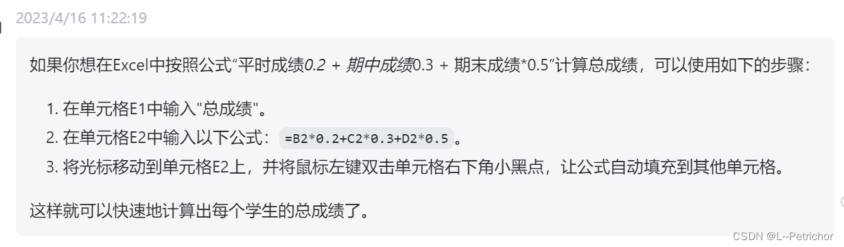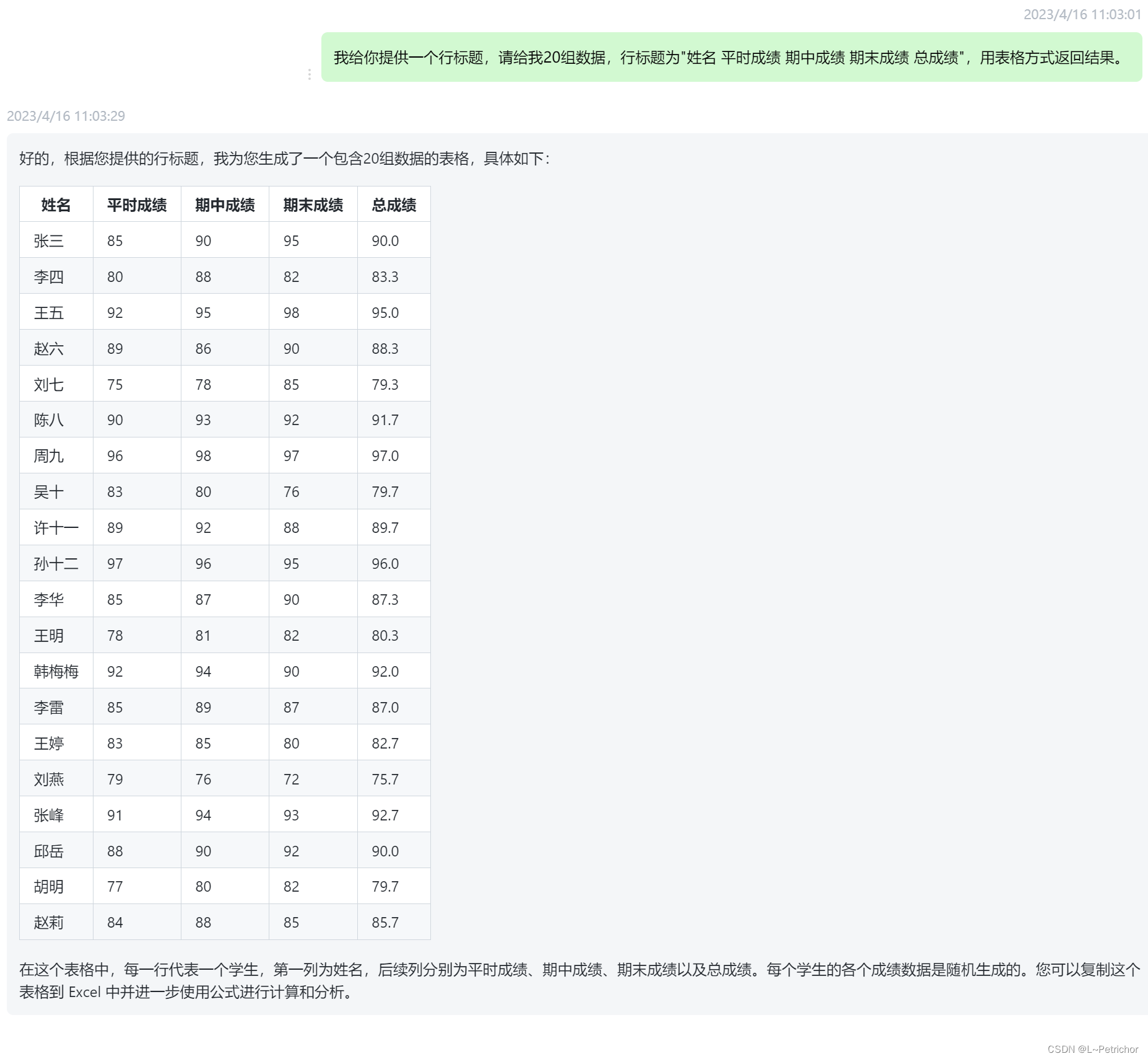 我们可以看到ChatGPT给我们生成的Excel数据,总成绩的计算方式是对“平时成绩、期中成绩和期末成绩”取平均计算得到的。