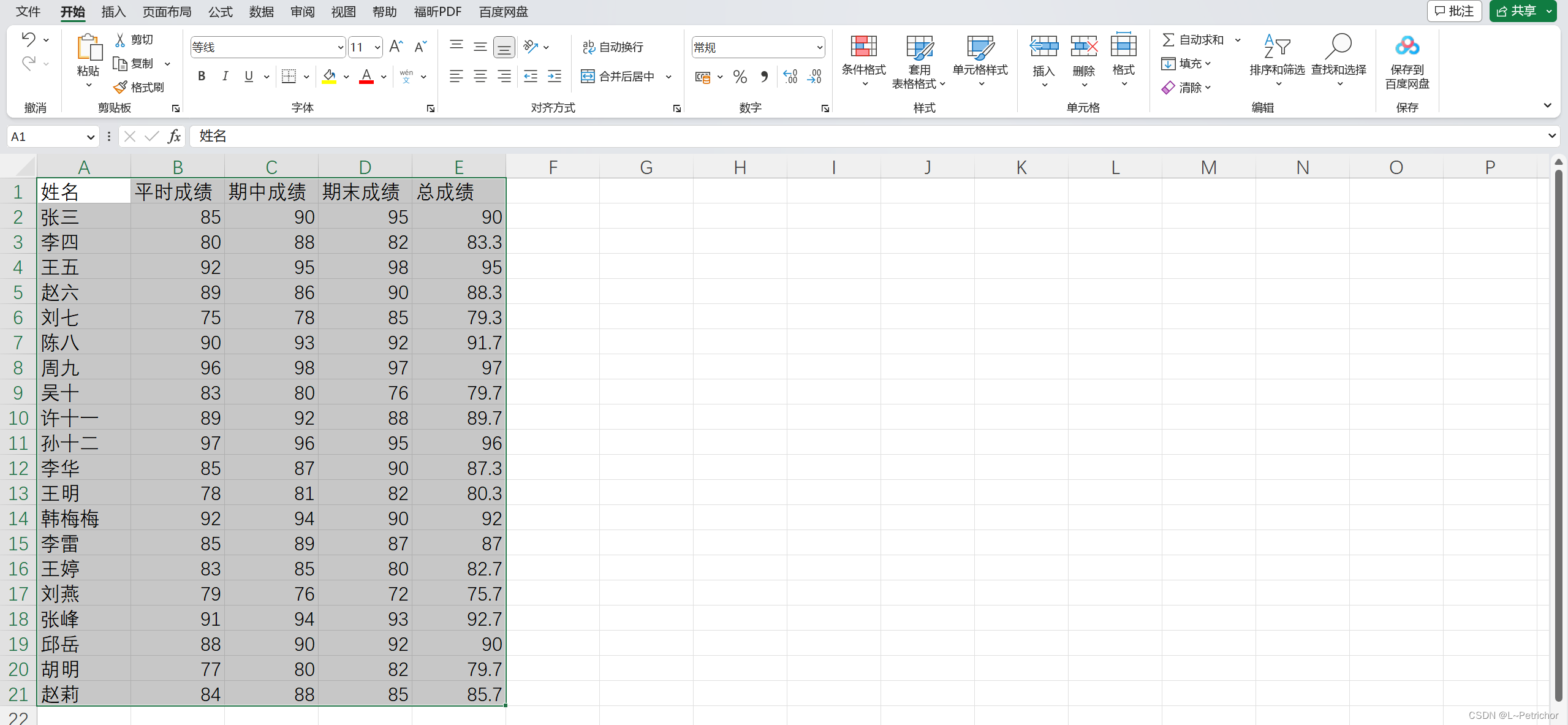 我给你提供一个行标题,请给我20组数据,行标题为"姓名 平时成绩 期中成绩 期末成绩 总成绩",用表格方式返回结果。