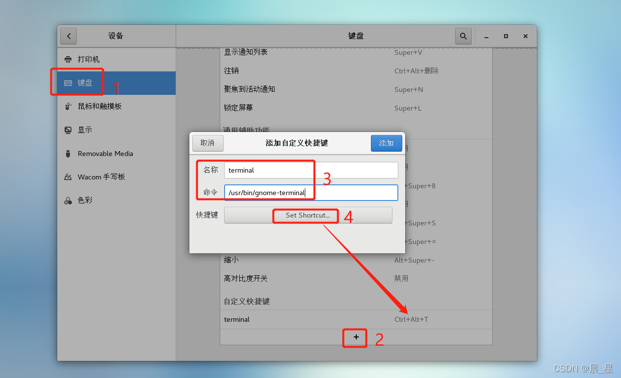 虚拟机安装图形化界面后如何快速打开terminal终端 Vmware图形化虚拟机中的linux怎么进入命令方式虚拟机安装图形化界面后打开terminal终端分为以下几种1、Ctrl+Alt+T快捷键打开(可能得提前设置)(Shift+Ctrl+T:以新标签页打开新终端)点击【设置按键】—>【设备】—>【键盘】—>【自定义快捷键】2、按win键(或叫 Super 键)后点击terminal终端3、Ctrl+Alt+F(2-7)切换纯命令行模式(不显示桌面)、Ctrl+Alt+F1切换图形化4、按win键进入搜索,搜索"终端"