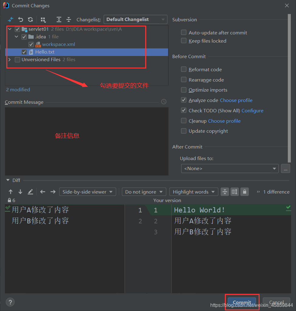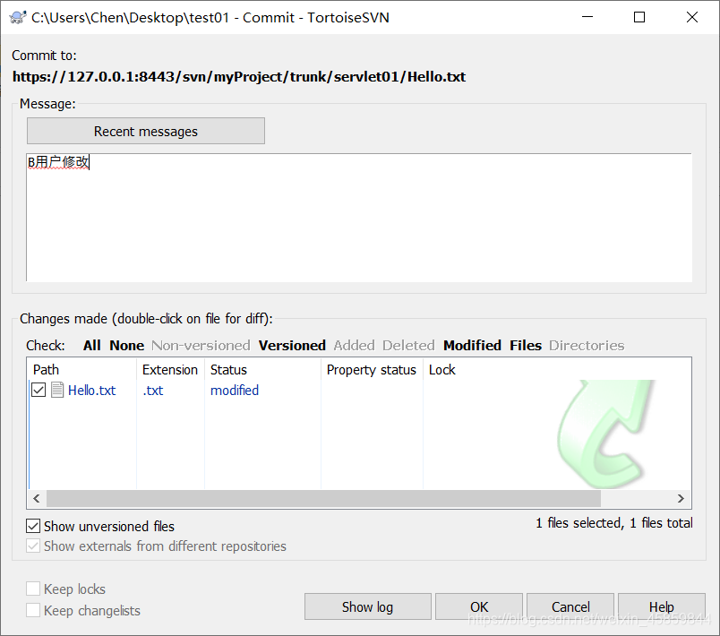 当你检出工作副本或者更新工作副本后,你的工作副本就跟版本库完全同步了。但是当你对工作副本进行一些修改之后,你的工作副本会比版本库要新。在 commit 操作之前复查下你的修改是一个很好的习惯。