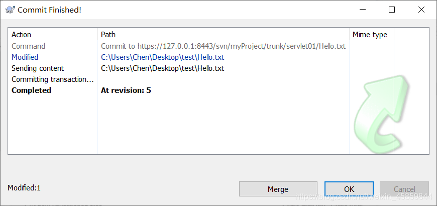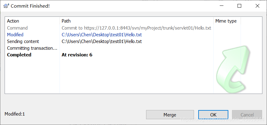 Commit 操作是用来将更改从工作副本到版本库。这个操作会修改版本库的内容,其它开发者可以通过更新他们的工作副本来查看这些修改。