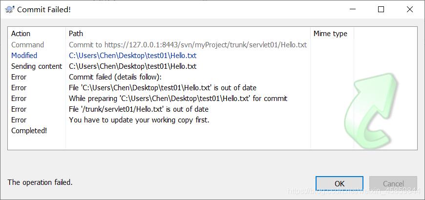 假设A、B两个用户都在版本号为100的时候,更新了kingtuns.txt这个文件,A用户在修改完成之后提交kingtuns.txt到服务器,这个时候提交成功,这个时候kingtuns.txt文件的版本号已经变成101了。同时B用户在版本号为100的kingtuns.txt文件上作修改,修改完成之后提交到服务器时,由于不是在当前最新的101版本上作的修改,所以导致提交失败。此时用户B去更新文件,如果B用户和A用户修改了文件的同一行代码,就会出现冲突。