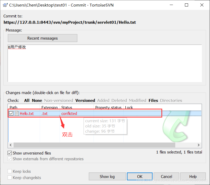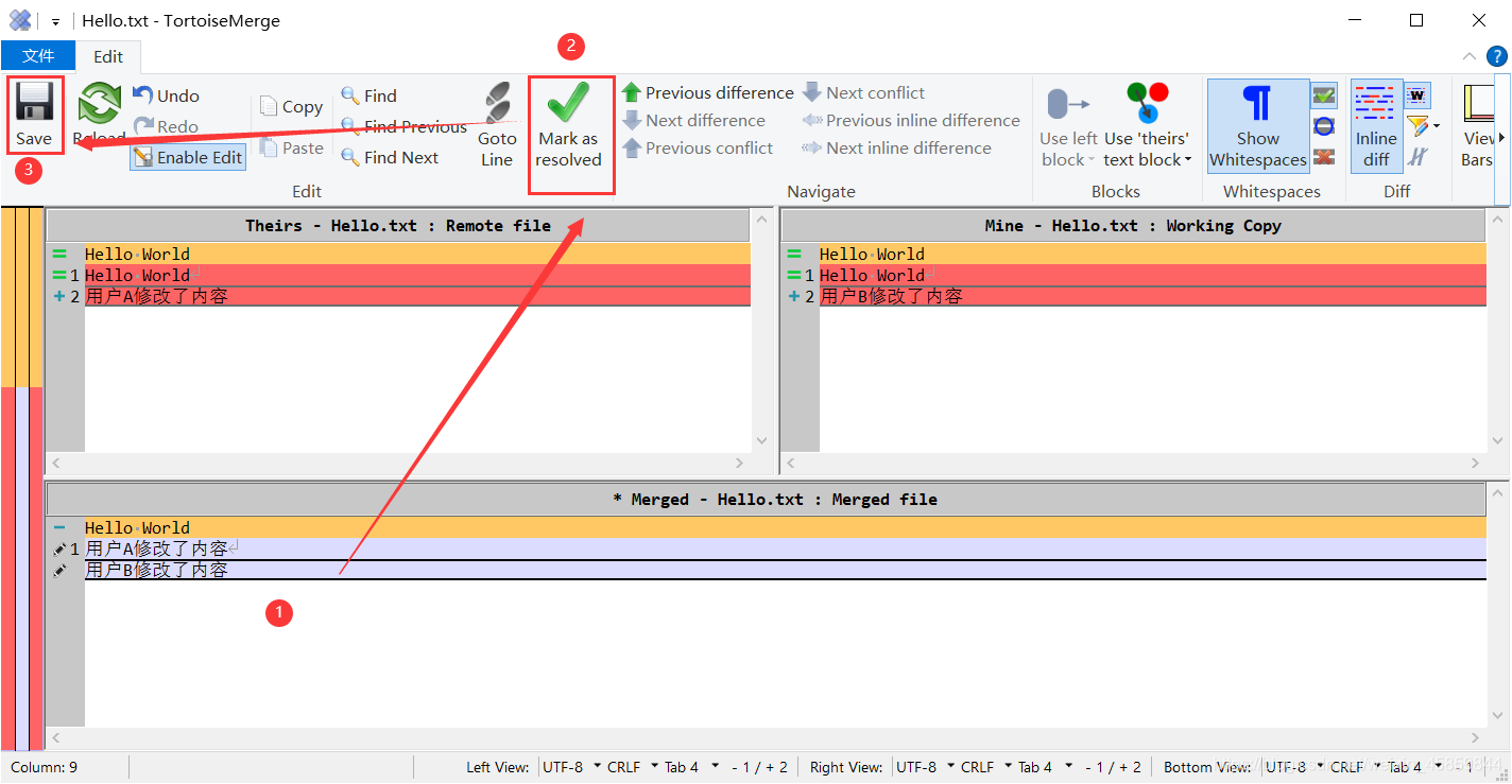 注:也可先不标记为解决,直接保存文件后,在B用户的冲突目录下,选中文件一右键菜单—TortoiseSVN—Resolved(解决)。然后再提交文件。