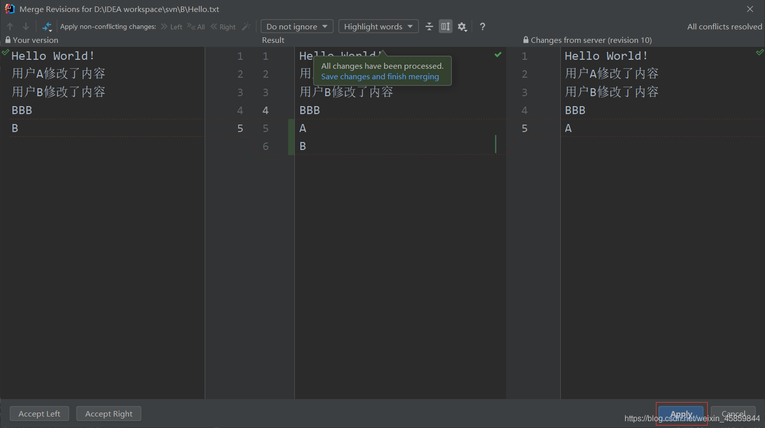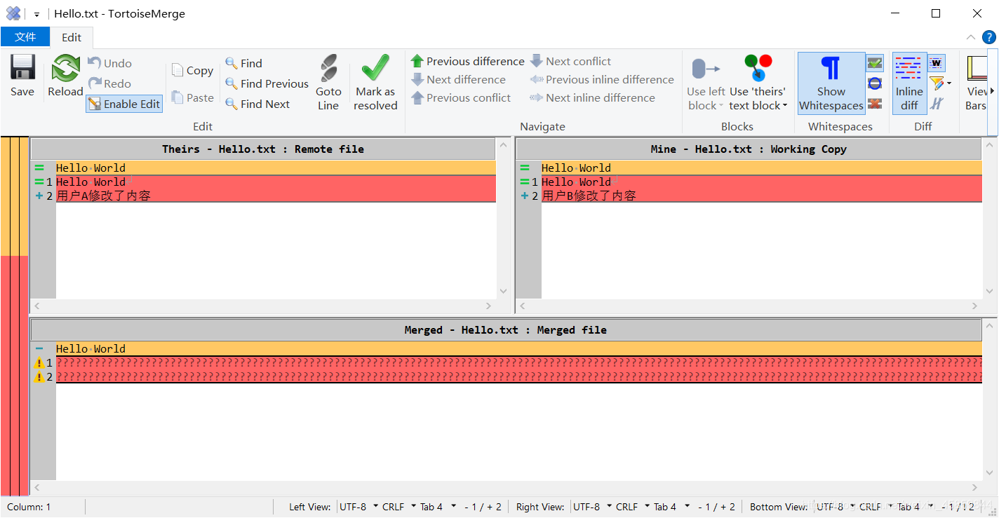 Theirs窗口为服务器上当前最新版本