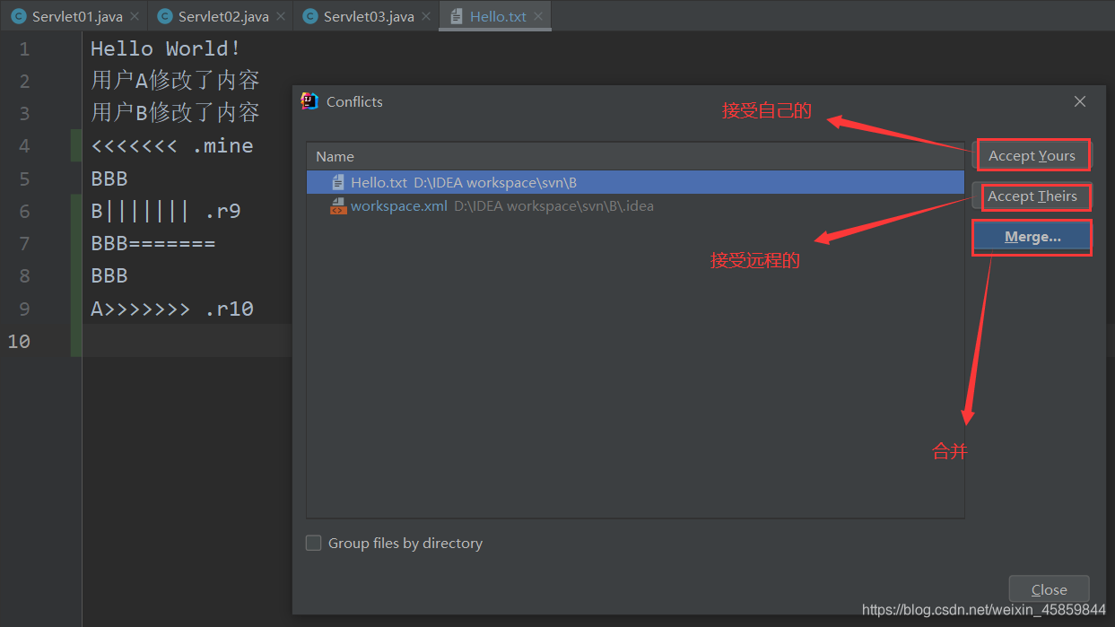 如果要使用服务器版本,在Theirs窗口选中差异内容,右键,选择Use this text block(使用这段文本块)。同理如果要使用本地版本,在协商后,在Mine窗口右键,选择Use this text block(使用这段文本块)。