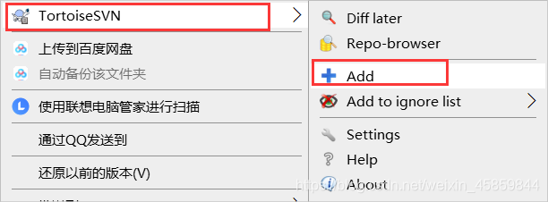 新建文件,右键选择TortoiseSVN,选择Add,将文件添加到版本库列表