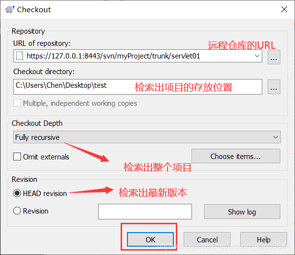 在需要检索项目的目录中,右键选择SVN Checkout...