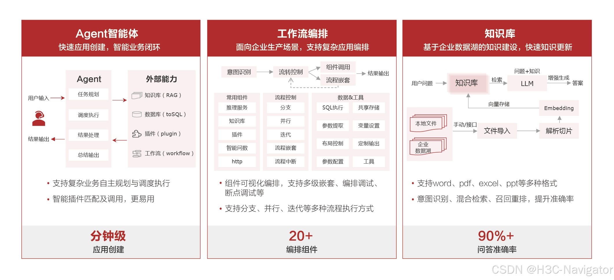 面对这场“快与慢”的博弈,新华三灵犀使能平台给出了全新的破局方式,即打造一个具备进化性、兼容性和敏捷性的一站式AI平台,将大模型落地从“押宝式创新”转变为“可持续演进”。在基础架构层面,需要以统一开发范式实现从芯片指令集到业务场景的纵向穿透,通过统一接口屏蔽底层硬件差异,使多元异构算力与多模态大模型可被封装为标准化能力模块;在管理调度层面,智能编排引擎基于业务目标动态校准计算能耗,实现推理任务与训练资源的弹性伸缩,确保每单位算力消耗精确映射商业价值;在应用构建层,敏捷的智能体要适配业务自由选取,通过可视化工作流快速完成场景适配。