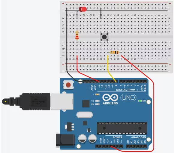 引脚也可用于读取数字信号(高/低电压)。在这里,我们将使用引脚 8 上的按钮(或开关)来打开/关闭引脚 13 上的 LED。