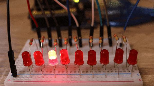 现在,我们将让一排 9 个 LED 一个一个地闪烁,朝向一样然后返回。使用引脚 2-10。
