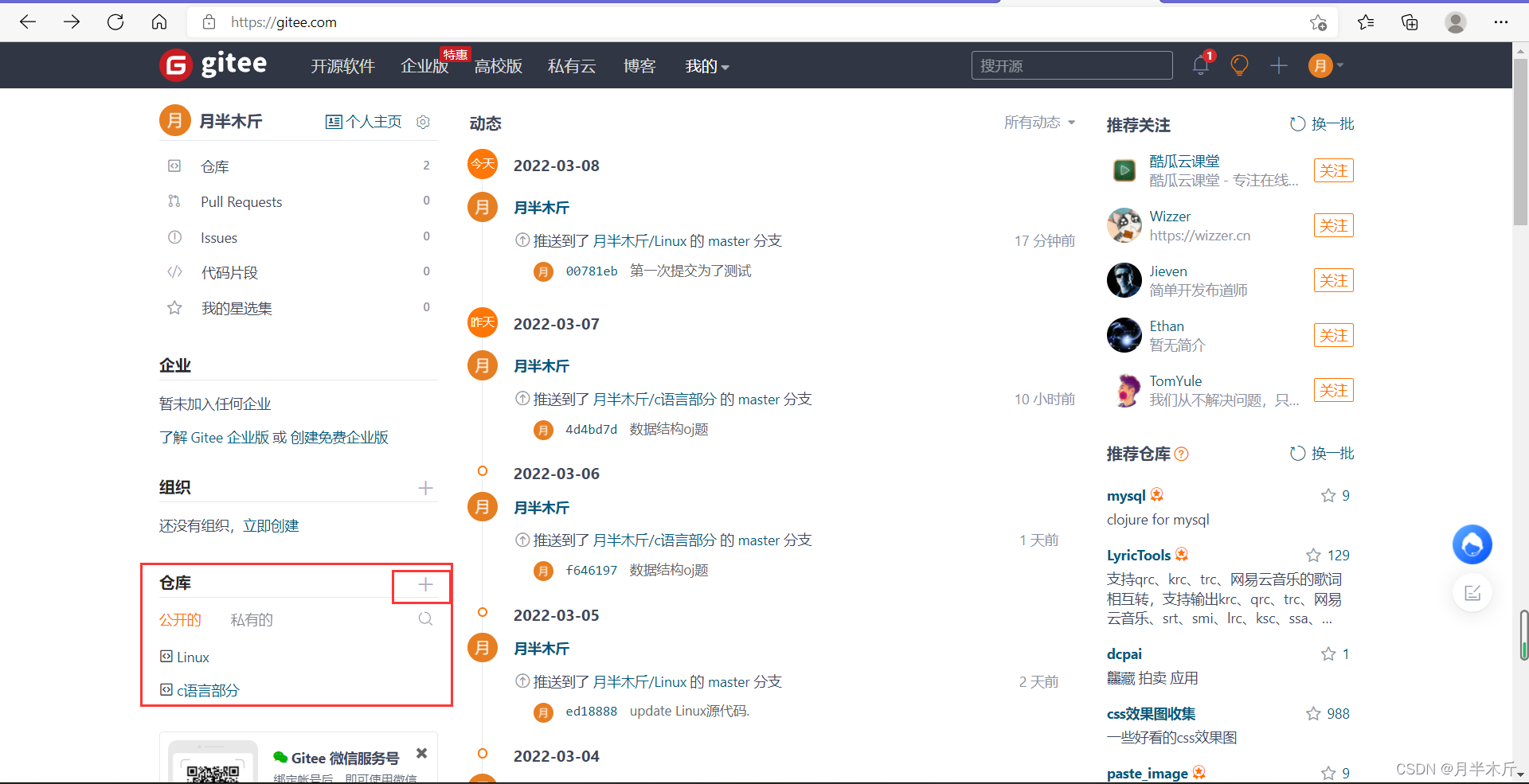 [2] 登录之后点击仓库,点击+号创建一个仓库,这一步也很简单,就按照指引一步一步创建就可以了。
