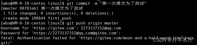 (2)然后出来提示Password for 'https://2273137152@qq.com@gitee.com':输入我们刚刚创建用户时设置的密码。(注意:在linux里面输入密码时不会显示任何字符的)然后就提交到我们的远端仓库了。