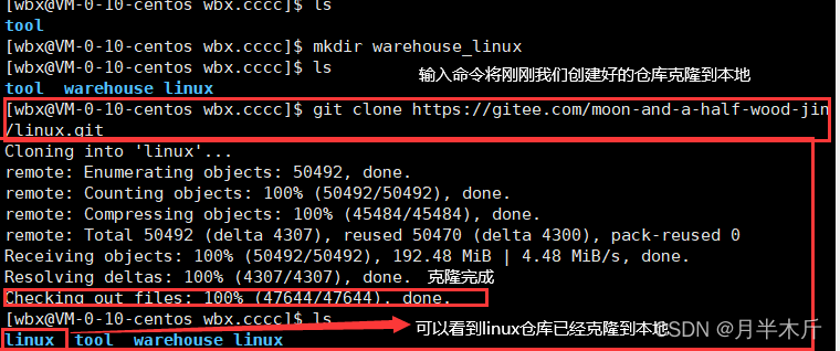 [4] 然后打开我们的xshell输入命令git + clone +[刚刚我们复制的网址]这样你就拥有一个和刚刚远端仓库链接的本地仓库了。我们之后可以用来向远端仓库传送我们的文件。