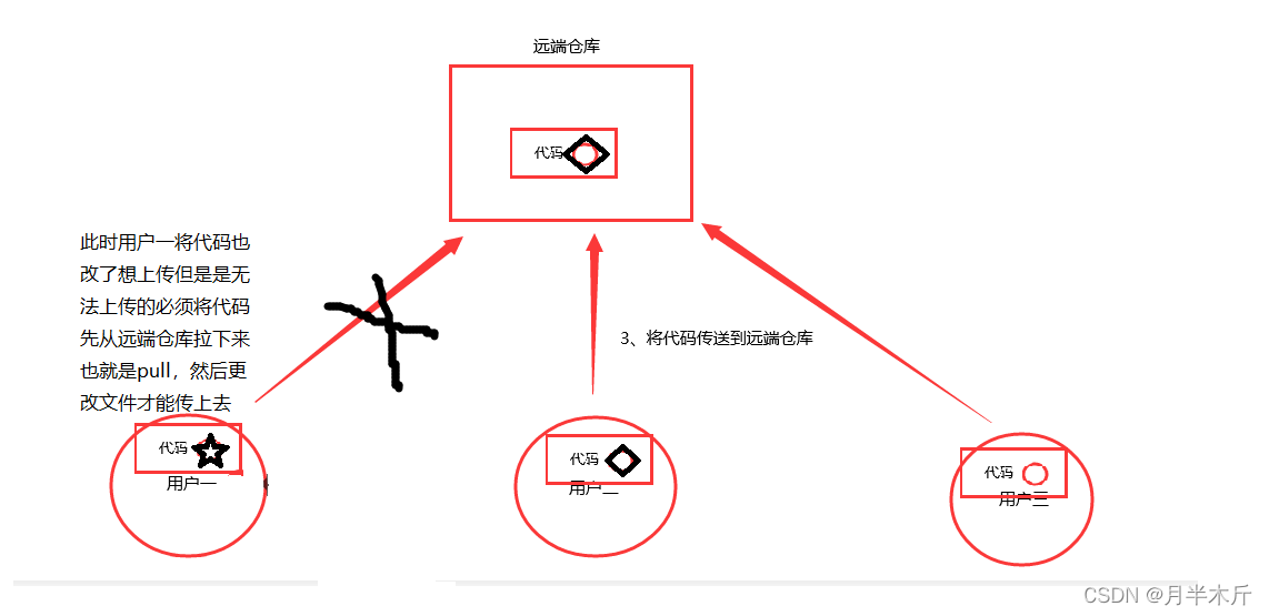 [4] 此时想要上传代码就必须先将远端仓库的代码(由用户二修改的代码拉下来)然后在这基础上才能修改。