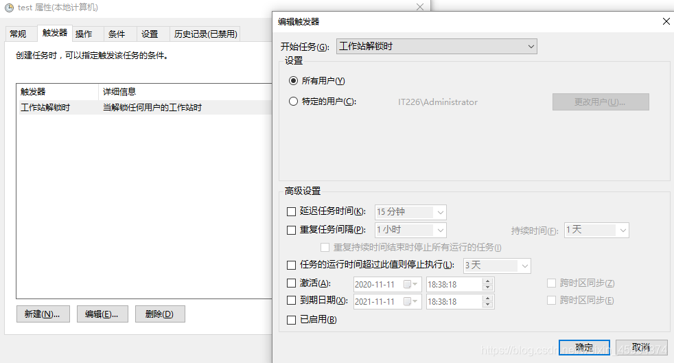 创建任务,选择只在用户登录时运行,选择触发器,新建触发器,根据自己需求进行维护(记得勾选已启用哦,我自己的禁用了任务)