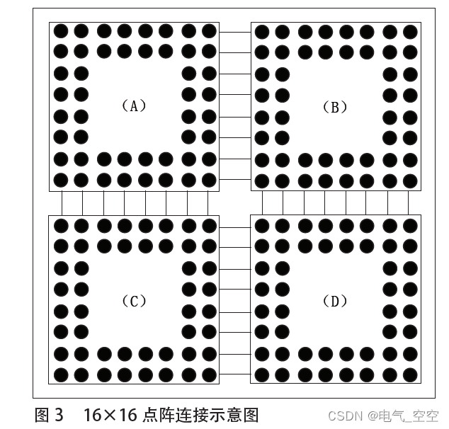 根据图2 可知,单片机作为LED 显示屏控制电路的主控单元,是保证控制效果的基础,实际操作过程中可以根据控制要求选定最合适的单片机。考虑到完整的汉字显示,需要最少四格 LED 显示模块连接在一起,文中提出将连接相邻的行和列,得到16×16 的点阵,如图3 所示。按照同样的方式组合四个16×16 的点阵,得到一个大小为64×16 的点阵。