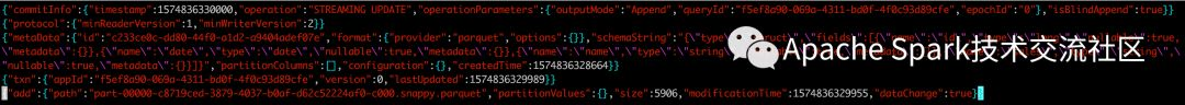 Delta每次事务commit都会产生一个json的元数据文件,文件内容包括本次commit做的所有action,比如AddFile/RemoveFile等等;