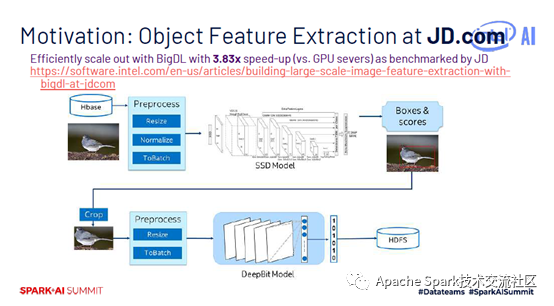 当时做BigDL的初衷是因为很多大数据用户希望使用深度学习的算法,如京东有大量图像存储在HBase上,需要对图像做预处理,将处理后数据放到模型中继续工作,还需要将特征提取结果存放在HDFS上,做图像相似性检索等应用。京东使用的是Caffe,与大数据集群不同的是,两个集群网络带宽有限,且图像经常更新,用户每次从GPU集群拉取到大数据集群网络开销都非常大。当英特尔将整个预测的pipeline搬到Spark集群上时,HBase和Spark可以结合在一起,提供零拷贝的处理策略,这种策略使得京东预测速度提升了3.83倍。