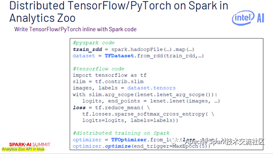 下图中代码部分是Analytics Zoo代码,train_rdd使用了Hadoop API,dataset是从train_rdd导出的TFDataset。开始构建TensorFlow模型,将其放到TFOptimizer中,再定义MaxEpoch。