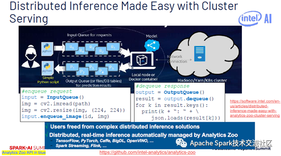 BigDL可以直接跑Spark集群上面,不需要对集群做修改,集成了很多英特尔特有的技术,对模型训练进行加速。大家如果对BigDL有兴趣可参考SoCC上发表的一篇工作。