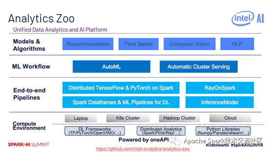 Analytics Zoo是统一的数据分析AI平台,支持笔记本、云、Hadoop Cluster、K8s Cluster等平台、此外,Analytics Zoo提供了端到端的pipeline,大家可以将AI模型应用到分布式大数据场景中。Analytics Zoo还提供了端到端的ML workflow和内置的模型和算法。具体而言,在底层的使用环境中,支持深度学习框架,如TensorFlow、PyTorch、OpenVINO等,还支持分布式框架,如Spark、Flink、Ray等,还可以使用Python库,如Numpy、Pandas、sklearn等。在端到端的pipeline中用户可以使用原生的TensorFlow和PyTorch,用户只需要很简单的修改就可以将原有的TensorFlow和PyTorch代码移植到Spark上来做分布式训练。Analytics Zoo还提供了RayOnSpark,ML Pipeplines,Automatic Cluster Serving,支持流式Serving。在内置算法中,提供了推荐算法,时序算法,视觉以及自然语言处理等。