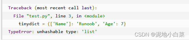2)键必须不可变,所以可以用数字,字符串或元组充当,而用列表就不行,如下: