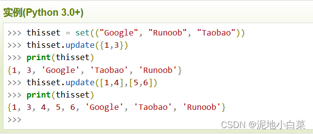 还有一个方法也可以添加元素,且参数可以是列表,元组,字典等,语法格式为:
