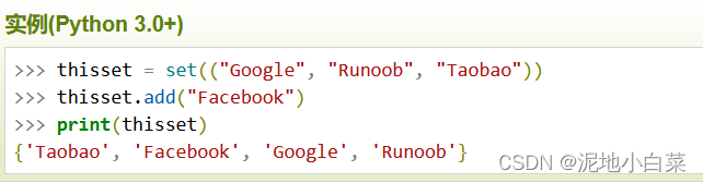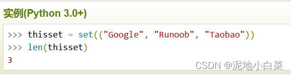 可以使用大括号{}或者set()函数创建集合,注意:创建一个空集合必须用set()而不是{},因为后者是用来创建一个空字典