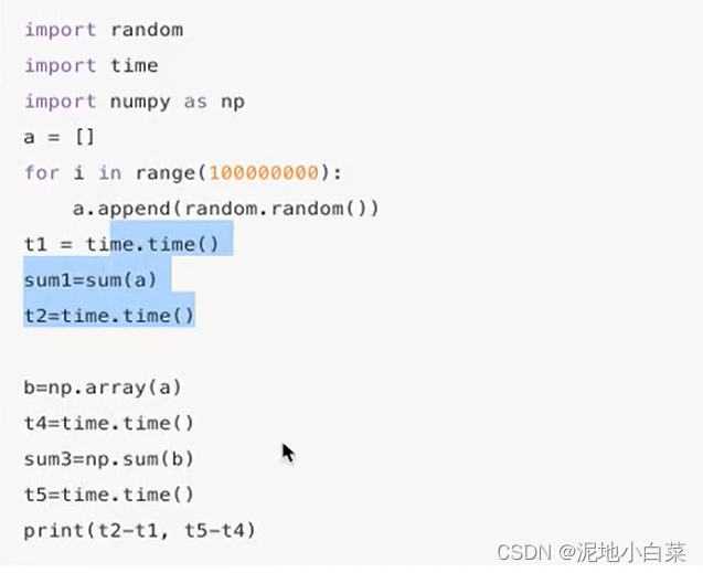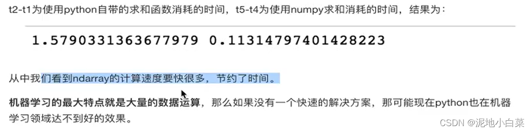 Numpy底层使用C语言编写,内部解除了GIL(全局解释器锁),其对数组的操作速度不受Python解释器的限制,效率远高于纯Python代码