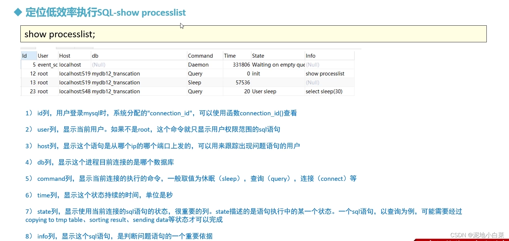 show processlist:该命令查看当前MySQL在进行的线程,包括线程的状态,是否锁表等,可以实时地查看SQL的执行情况,同时对一些锁表操作进行优化