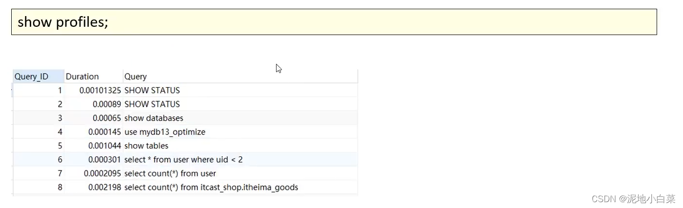 执行完上述命令之后,再执行show profiles指令,来查看SQL语句执行的耗时: