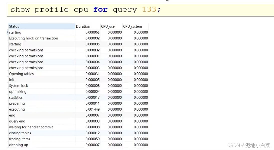 通过show profile for query query_id语句可以查看到该SQL执行过程中每个线程的状态和消耗的时间: