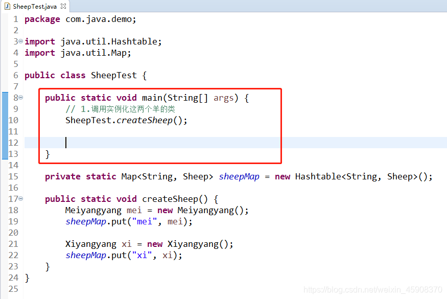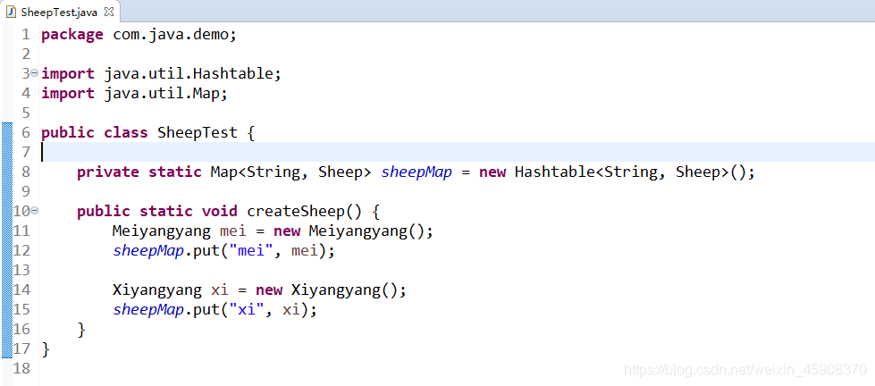 接着,重点来了,我们来创建一个测试类,名字叫SheepTest,然后在类里面实例化他们,并将他们存储到一个Map集合当中。