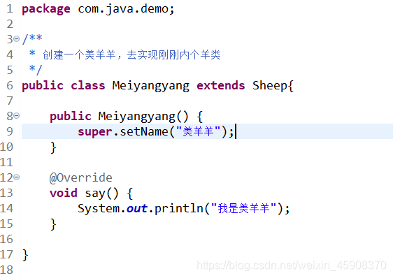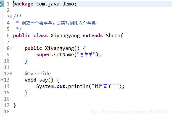 然后,我们创建一个喜羊羊和一个美羊羊,两个羊,并且去继承这个Sheep这个类: