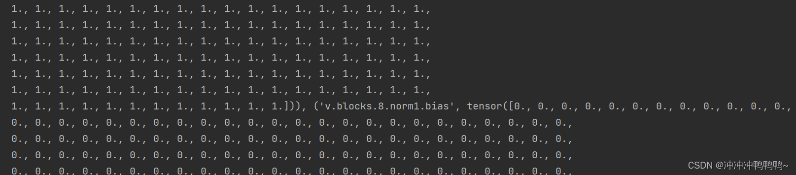 模型参数更新之前,参数处于初始状态,有很多0和1,输出的部分截图如下: