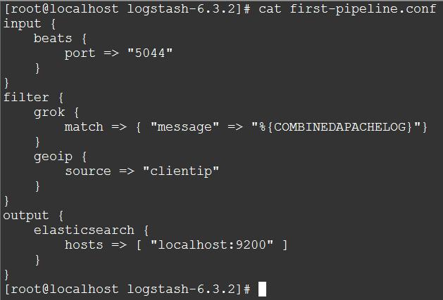 接下来,编辑first-pipeline.conf文件,加入grok filter,在你修改完以后这个文件看起来应该是这样的: