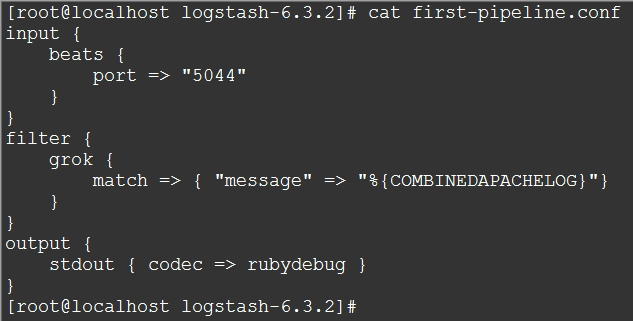 (画外音:刚才说过了通常Logstash管理有三部分(输入、过滤器、输出),这里input下面beats { port => "5044" }的意思是用Beats输入插件,而stdout { codec => rubydebug }的意思是输出到控制台)