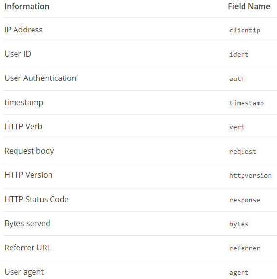 为了解析数据,你可以用 %{COMBINEDAPACHELOG} grok pattern ,这种模式(或者说格式)的schema如下: