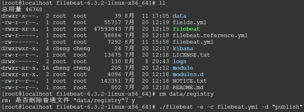 (画外音:首先,Ctrl+C终止Filebeat;接着rm data/registry删除注册文件;最后,./filebeat -e -c filebeat.yml -d "publish" 启动Filebeat)
