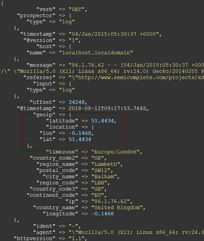 再次查看Logstash控制台,我们会发现多了地理位置信息: