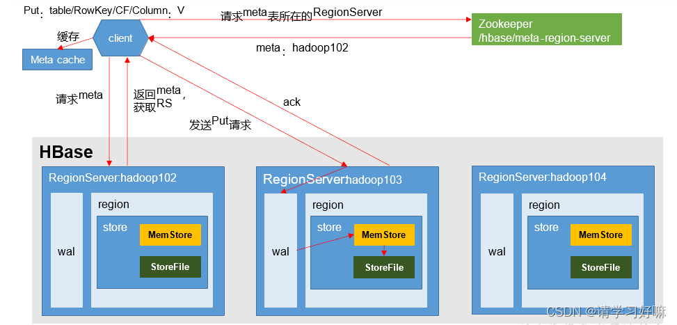 1.client先访问zookeeper集群,得到所有数据的hbase:meta表位于哪一个regionserver