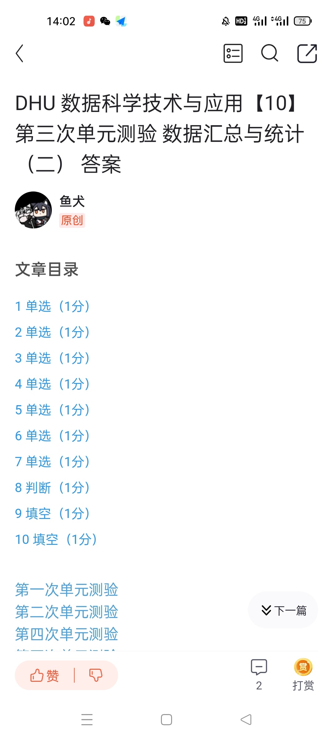 DHU 数据科学技术与应用【8】 第1-4次单元测验 答案 下面________不是大数据的特征。 下面关于数据科学与大数据之间的关系描述,错误的是________。 names=np.array([’马化腾’,’李彦宏’,’雷军’,’扎克伯格’]),names[2]的值是________。 记录同学成绩的scores数组如下,scores[ 1:3, [2,5]] 取得的数据是________。 names记录同学名字,subjects记录考试科目数据中,scores记录同学成绩,求Python课程成绩的最高分的语句________。