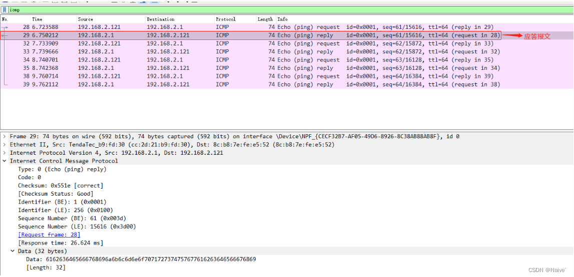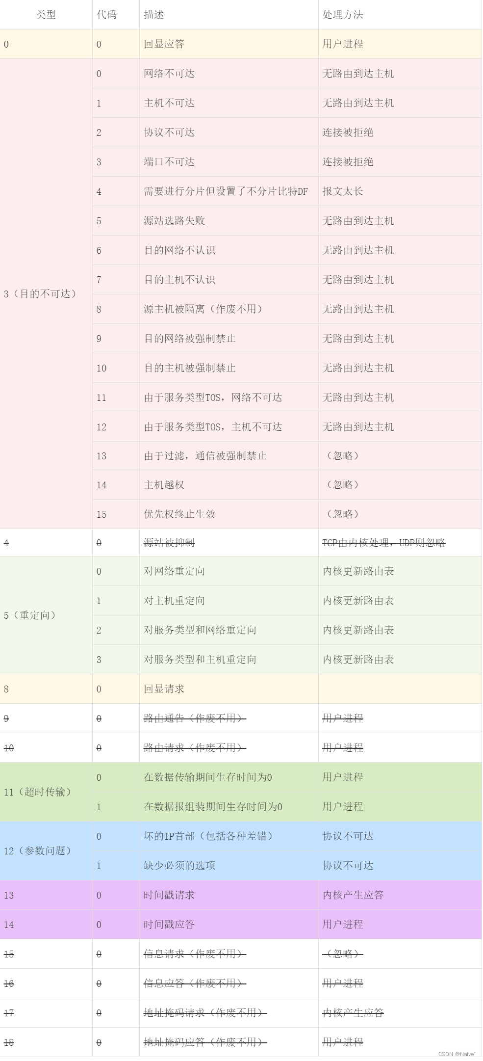 Ping命令,使用的就是响应请求(Type=8)和应答(Type=0),一台主机向一个节点发送一个 Type=8 的 ICMP 报文,如果途中没有异常,则目标返回 Type=0 的 ICMP 报文,说明这台主机存在