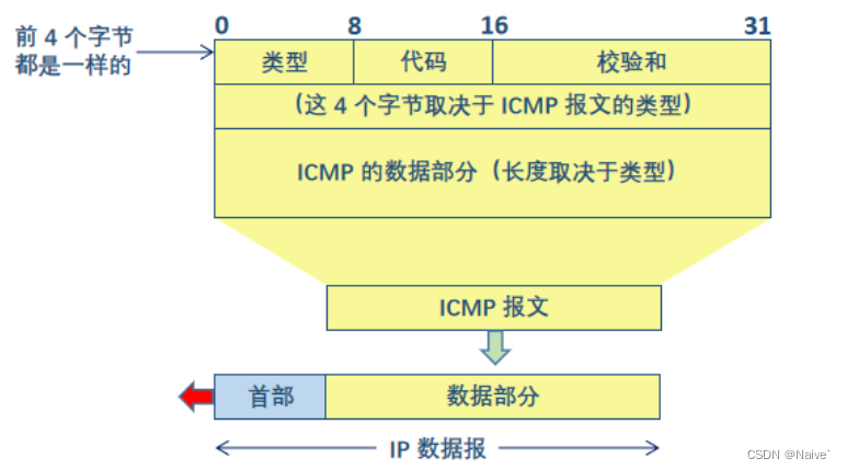 ICMP报文的前4个字节是统一的格式,共有三个字段:类型、代码和检验和。接着的4个字节的内容与ICMP的类型有关。最后面是数据字段,其长度取决于ICMP的类型。
