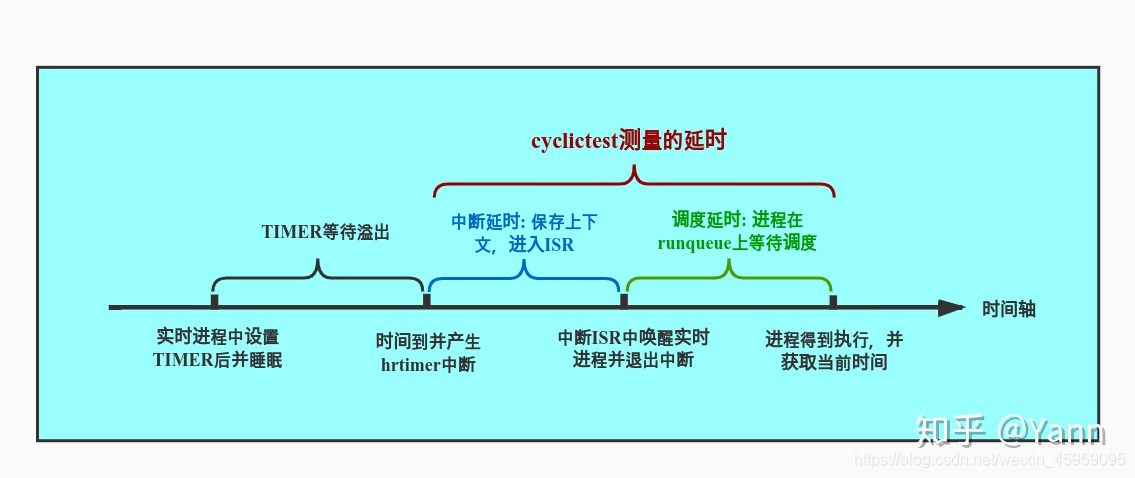 Cyclictest所测试的延时包括:产生时钟中断到线程的到执行的时间(响应中断+等待调度)。