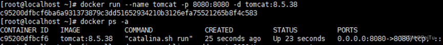 docker run --name tomcat -p 8080:8080 -d tomcat:8.5.38